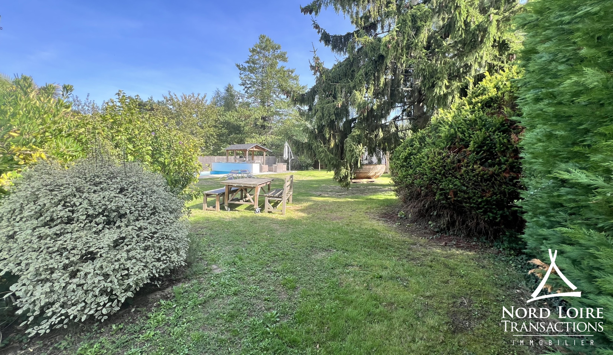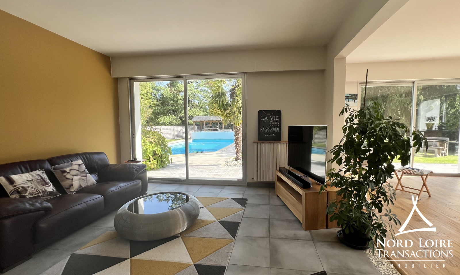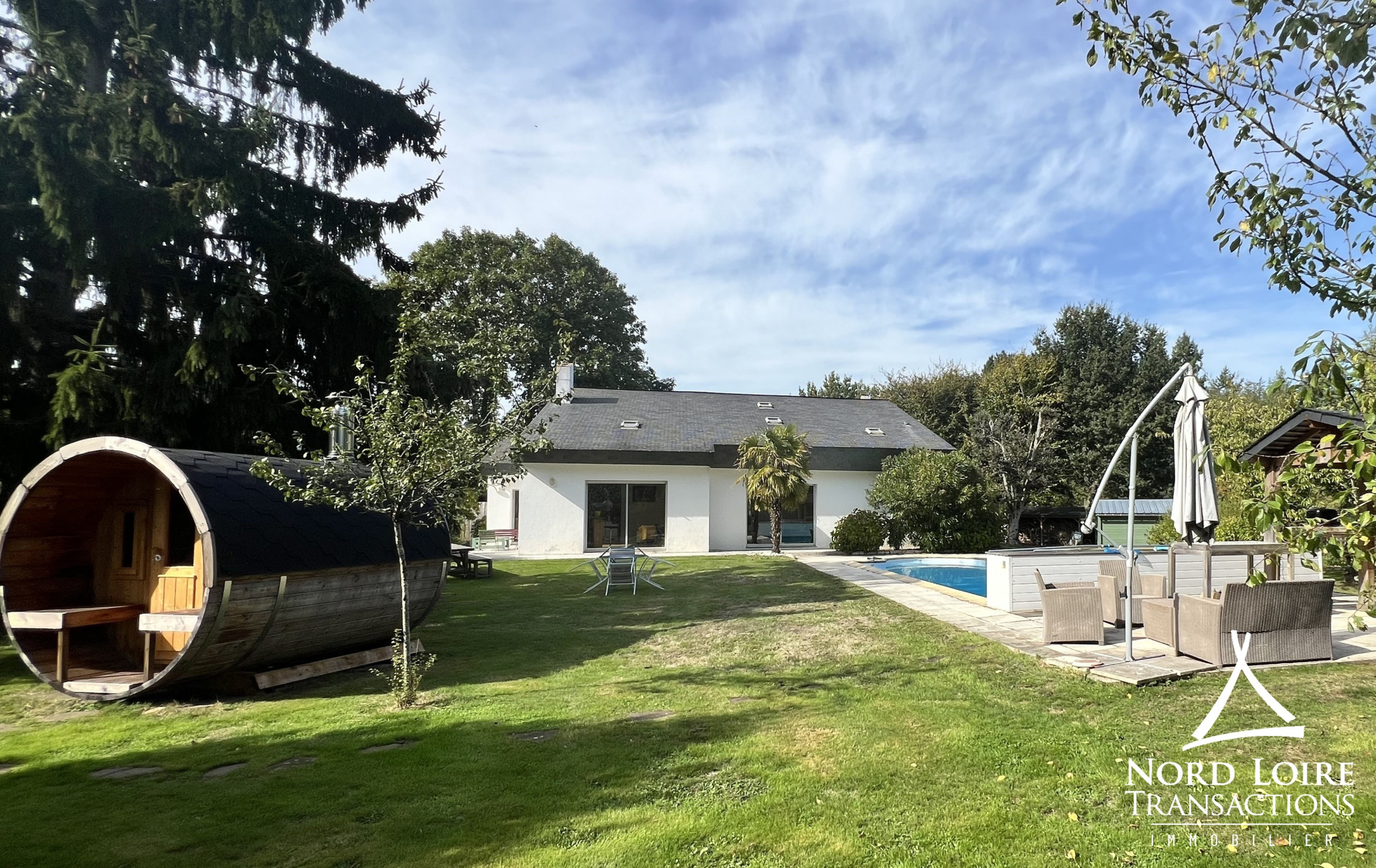 La maison s’ouvre sur de vastes terrasses, un jardin de 1600 m² doté d'une piscine avec fosse de plongée, une cuisine d’été et un sauna tonneau, le tout dans un environnement paisible, à deux pas de Nantes.
