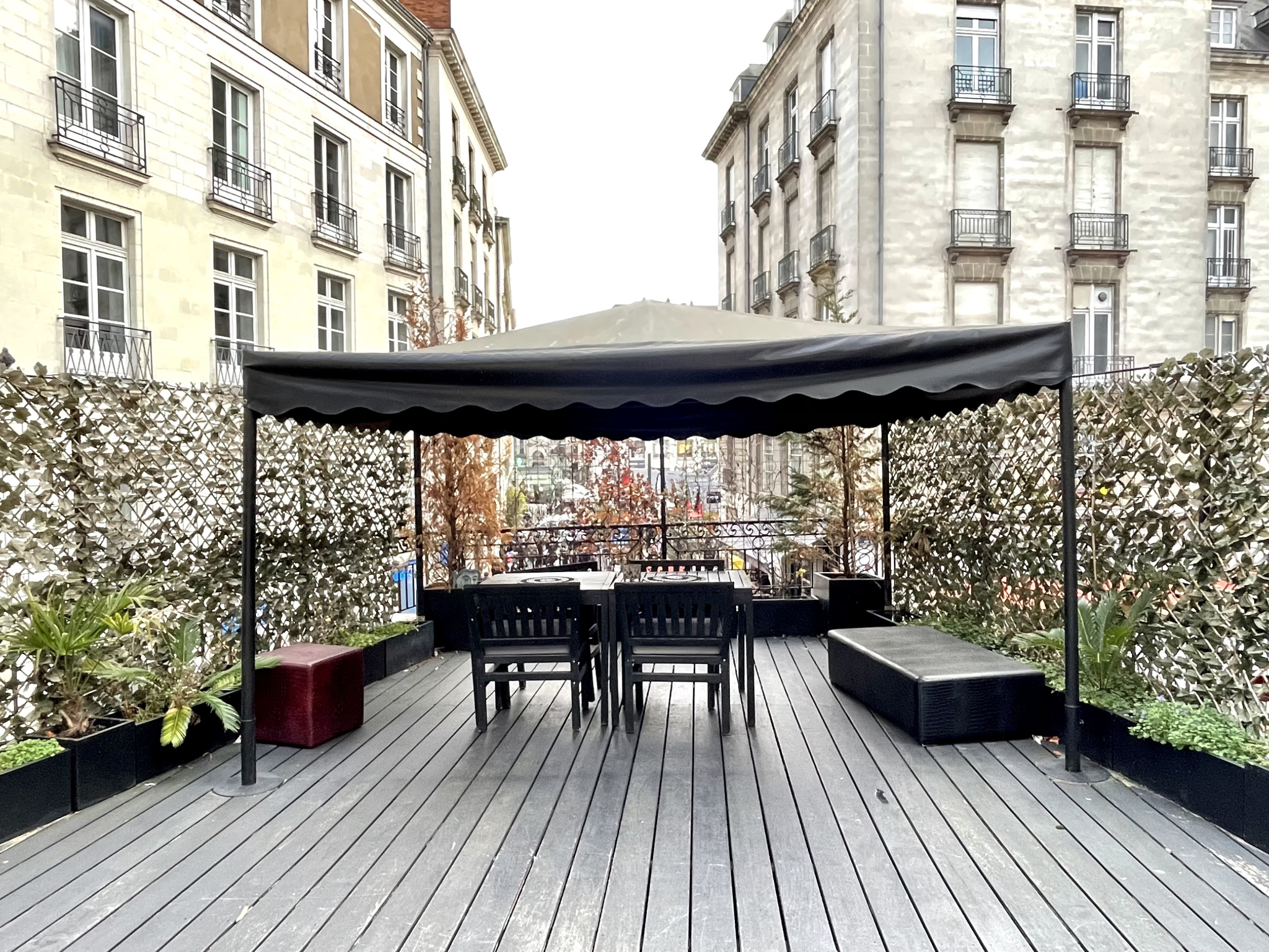 Nantes (44000)Tout près de la place Royale, ce très bel appartement rénové vous offrira un beau salon, une salle à manger avec cuisine semi-ouverte, donnant sur une magnifique terrasse de 50 m2, trois belles chambres, un vaste dressing, une salle de bains, une salle d'eau, un bureau.