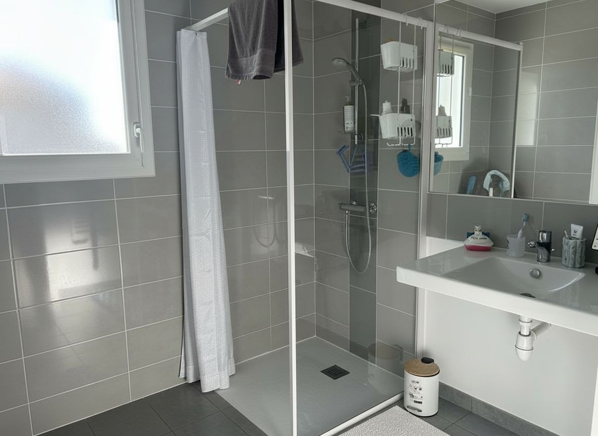 L'extérieur entièrement clos dispose d'une terrasse en béton désactivé. Chauffage gaz au sol. Panneaux photovoltaïques en auto-consommation.