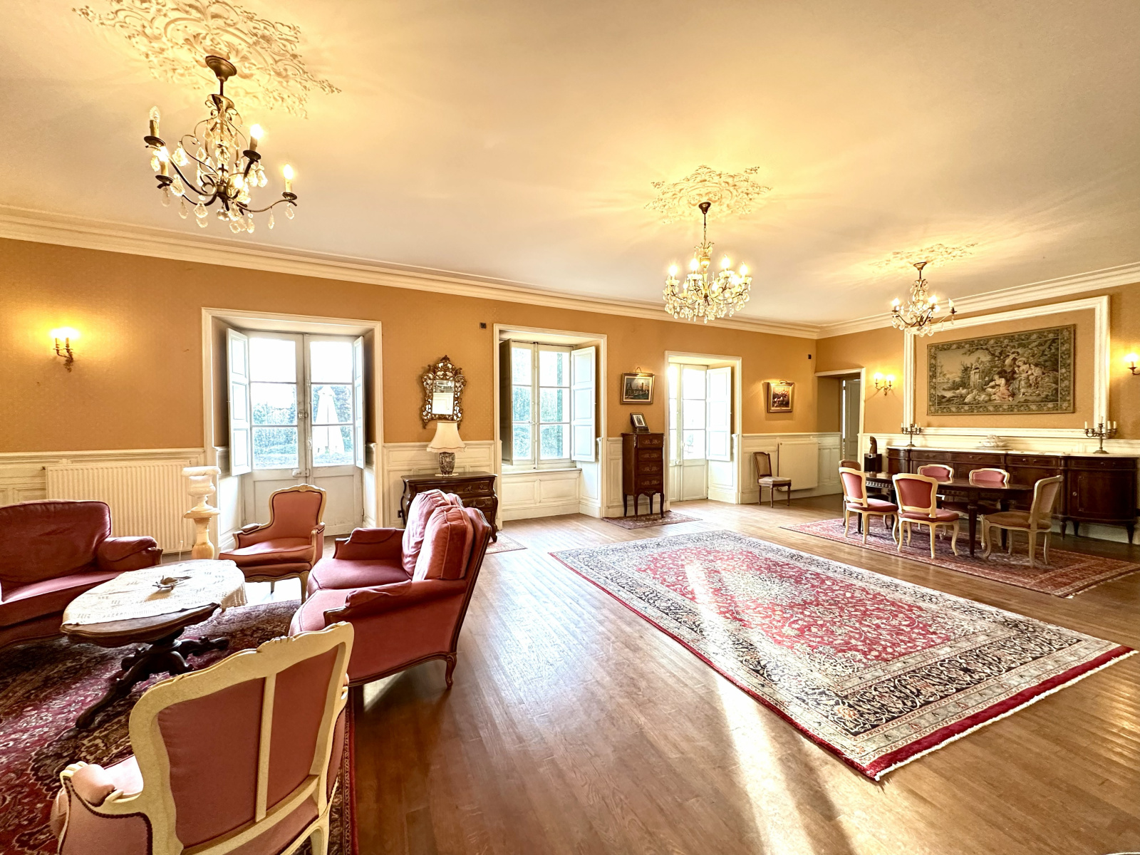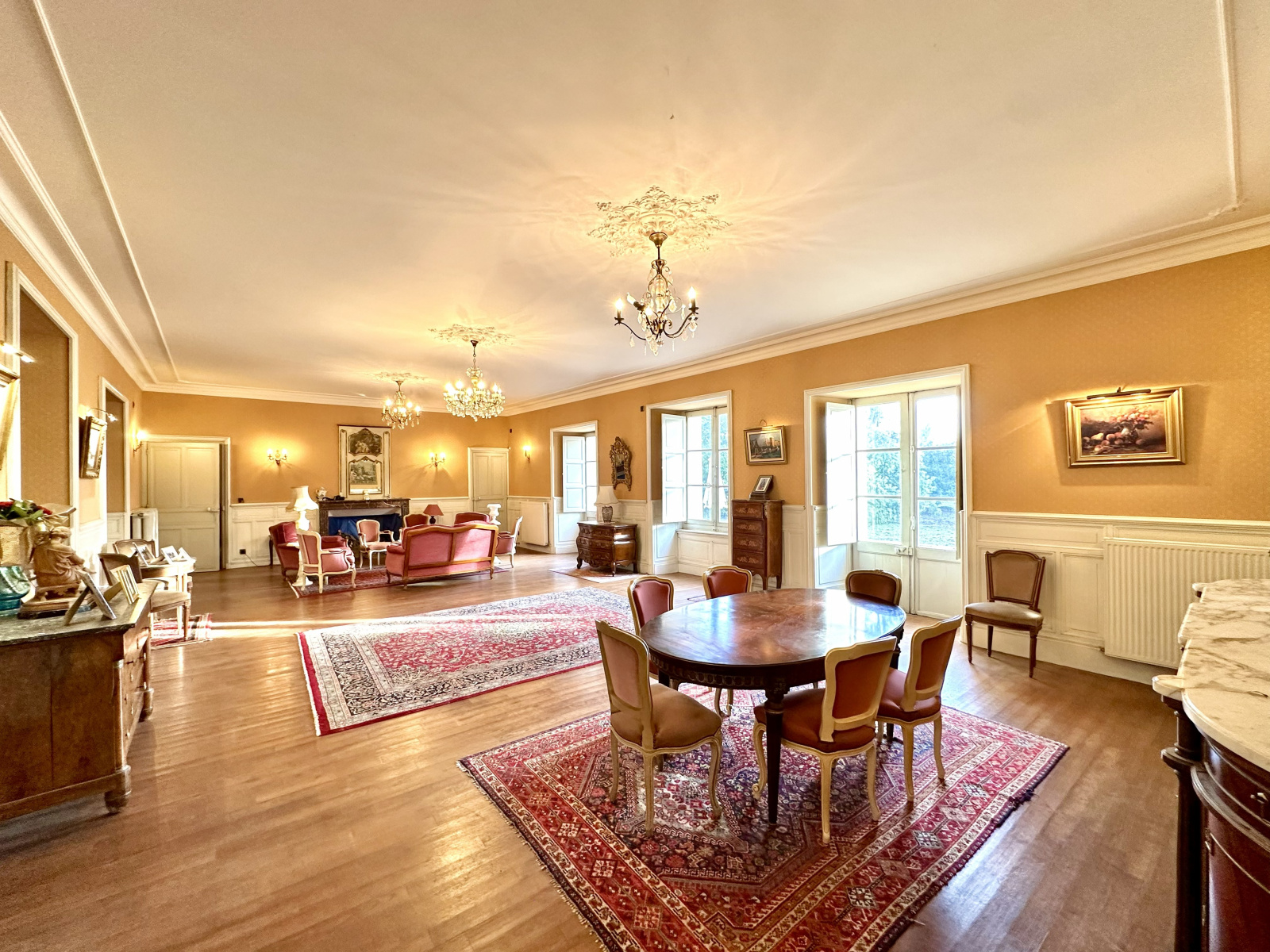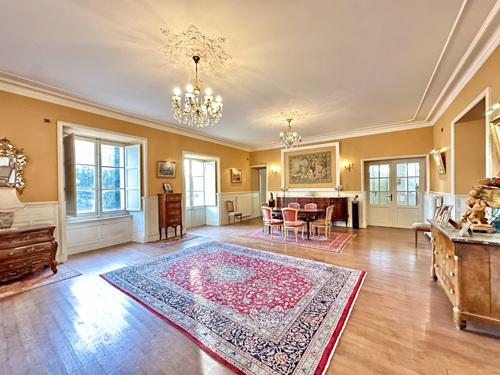 Cette belle propriété VIIIème à 1 500 m de la gare vous offrira dans la partie château, un ensemble de 200 m² de salons (salon principal : 100 m²), six grandes chambres, toutes dotées d’une salle de bains + wc.