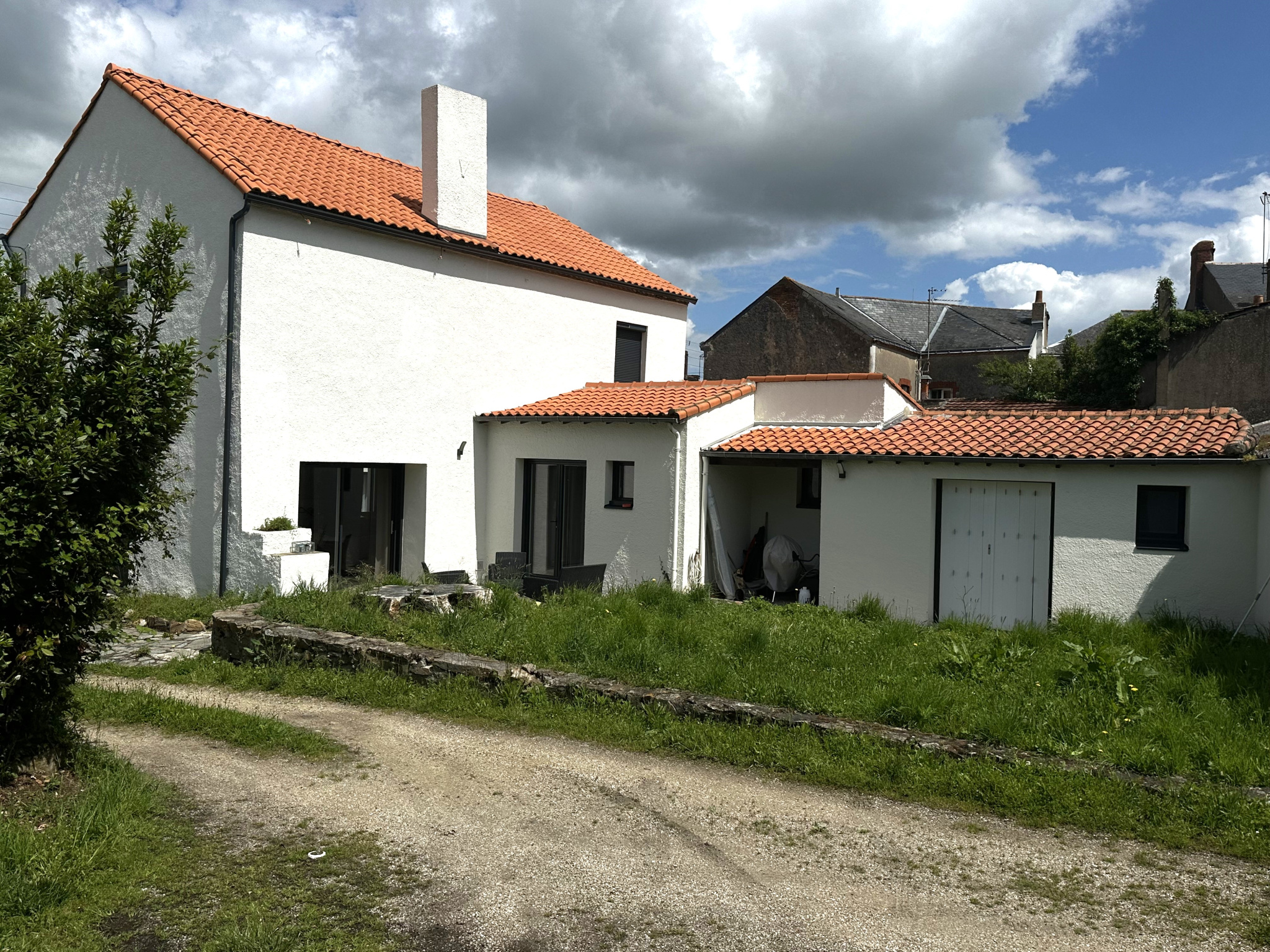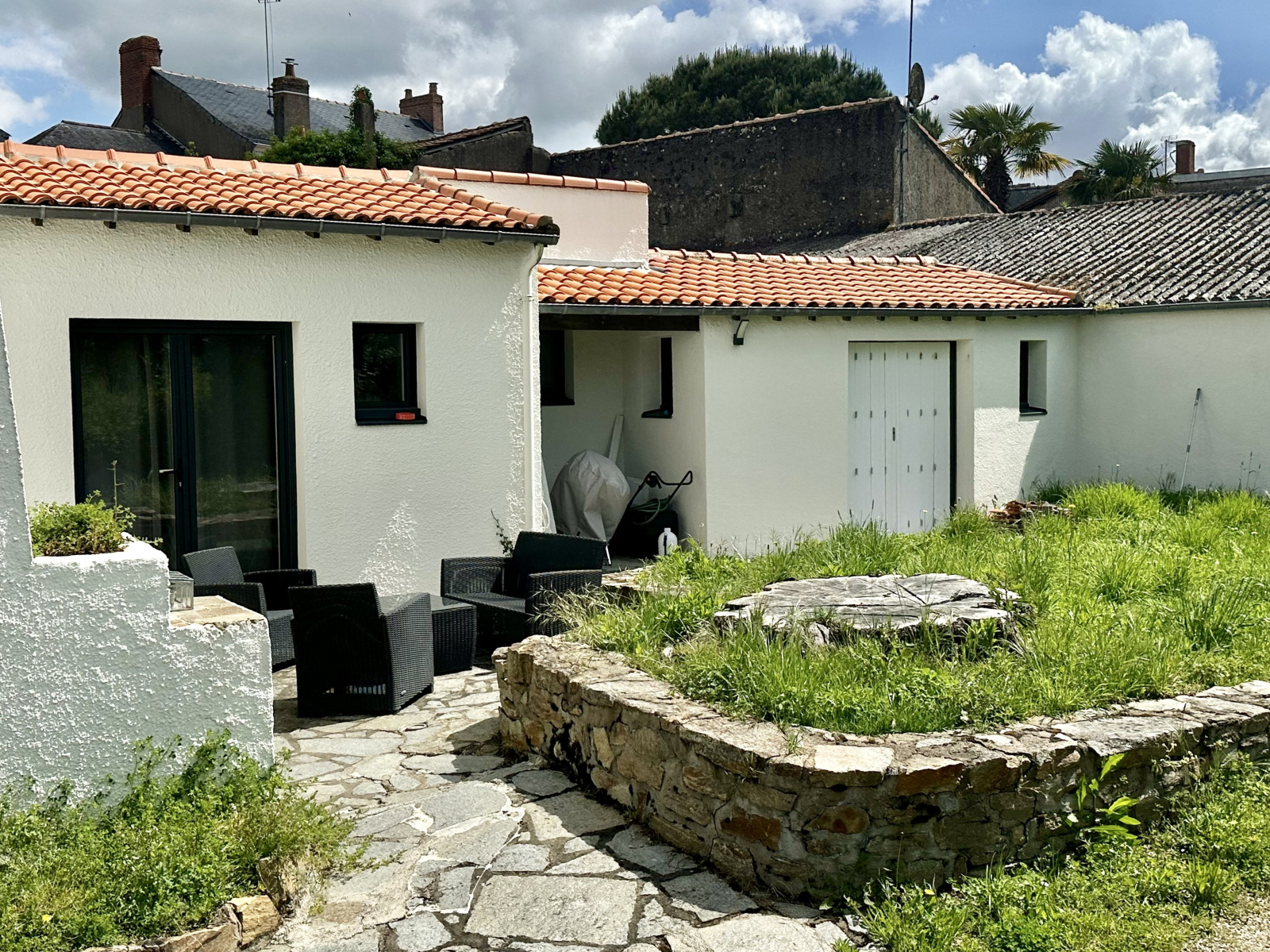 Jardin avec terrasse et place de stationnement.