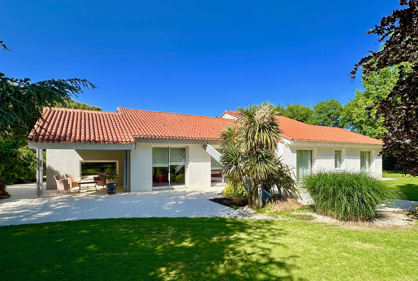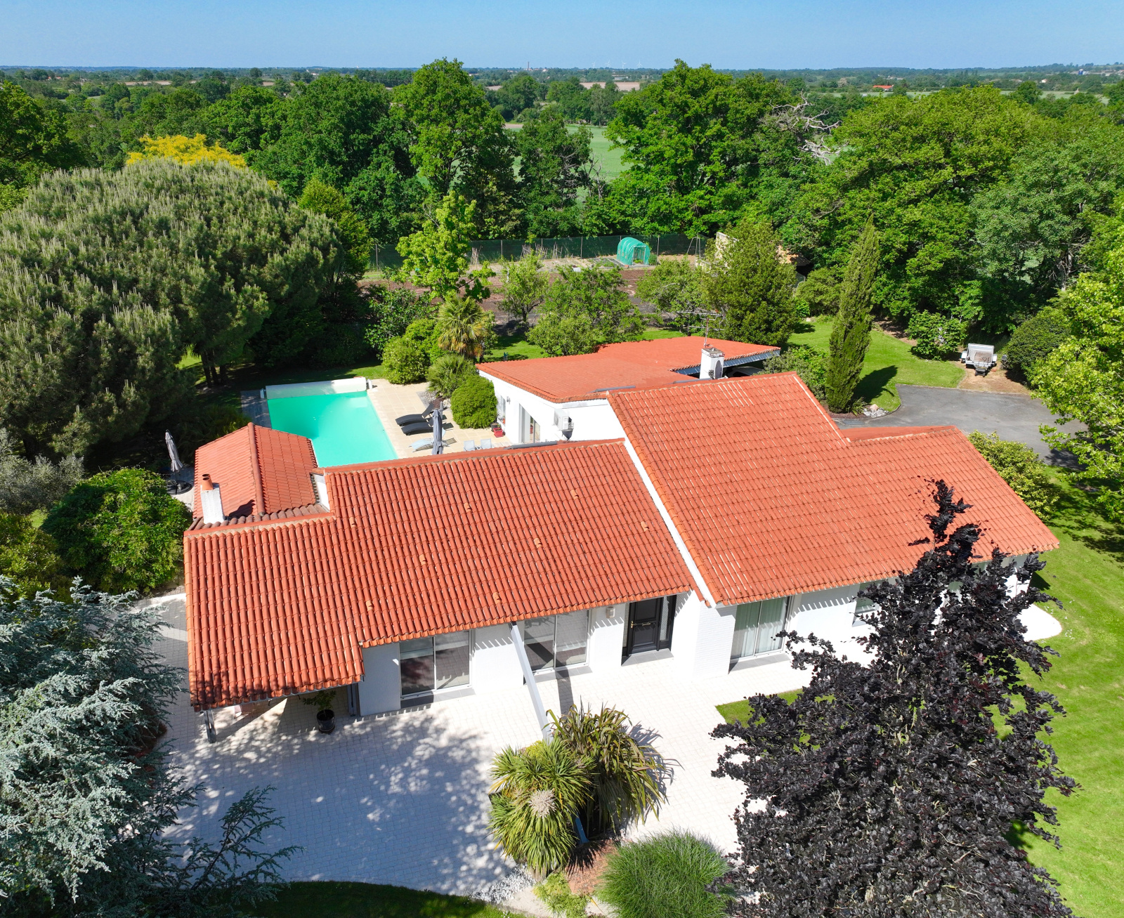 Un préau pour 3 voitures avec une borne de rechargement des véhicules électriques ainsi que de diverses dépendances complètent ce bien de qualité.